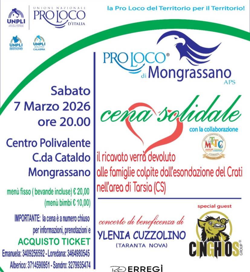 A Mongrassano va in scena la solidarietà: la Pro Loco APS, oltre a ad avere sostenuto e supportato fattivamente gli amici di Tarsia, colpite dalla esondazione del Crati, sin dal primo momento, con beni di prima necessità e con pasti caldi, organizza per sabato 7 marzo, una cena solidale, grazie al supporto della scuola Alberghiera di Cosenza e a diverse aziende che hanno messo a disposizione i loro prodotti e a tutti i volontari e le persone che in qualche modo hanno contribuito.