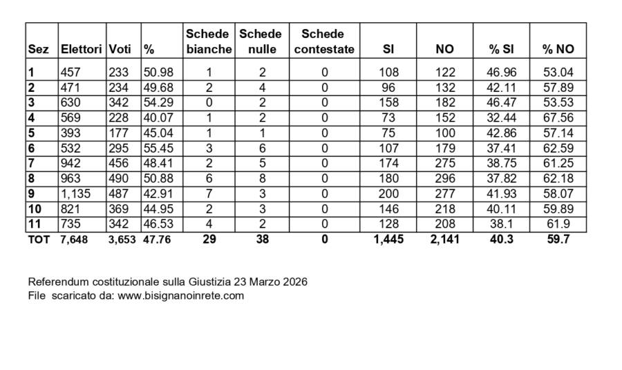 A Bisignano il referendum si chiude con la vittoria del NO, che raggiunge il 59,7% dei consensi contro il 40,3% del SÌ. Un risultato netto, maturato al termine dello spoglio in tutte le sezioni del comune, che segna una presa di posizione chiara dell’elettorato locale sulla riforma sottoposta a consultazione.