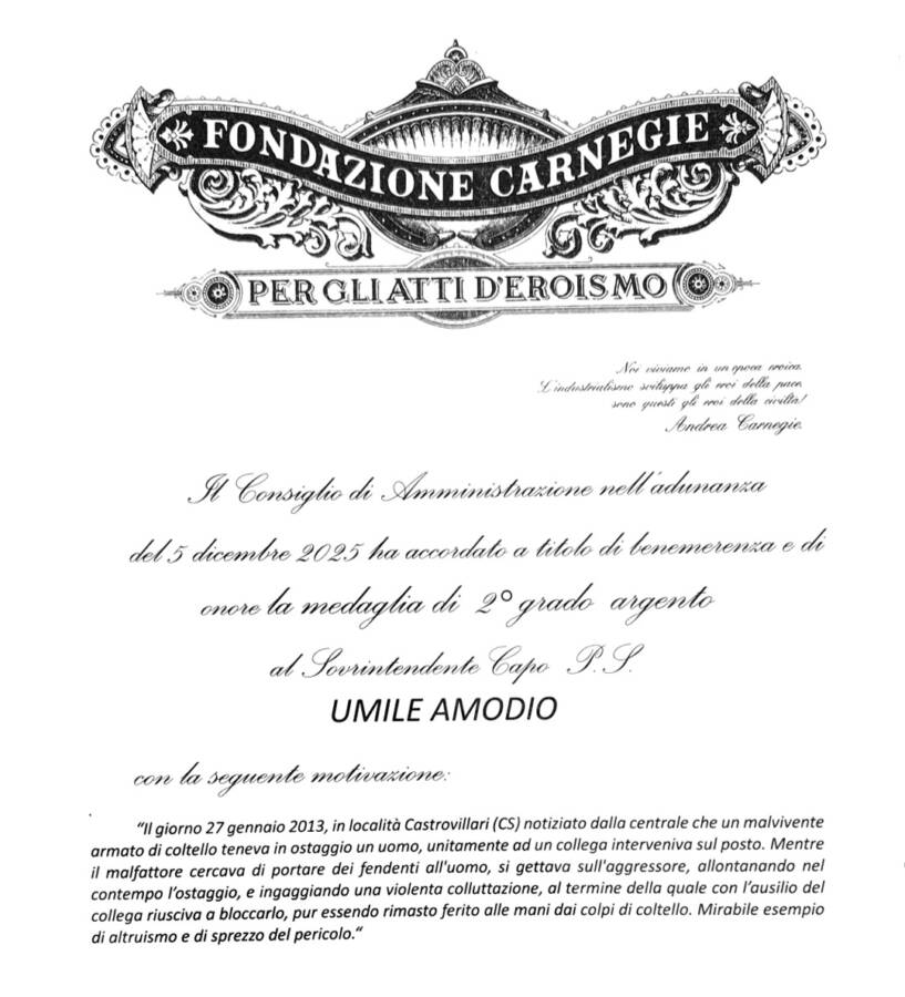 La benemerenza e il secondo grado d’argento ad Amodio è arrivata dal Ministero dell’Interno presso il Salone d’onore del Comando Generale della Gdf che ospitava l’evento su delibera del consiglio di amministrazione della Fondazione Carnegie che si occupa di valutare eventi premiali dove i cittadini o appartenenti alle FFOO o FFAA in tempi di pace si sono distinti in atti di eroismo a tutela della vita. altrui. In ciò, quanto ha motivato la scelta spiegando quello che ha fatto lo stesso sovrintendente che – con coraggio e professionialità – ha svolto il suo dovere più che egregiamente